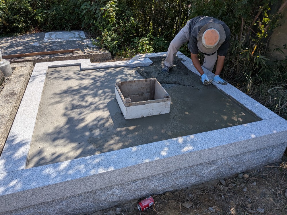 お墓跡地はモルタル塗り仕上げ、これで完了です。ありがとうございました。